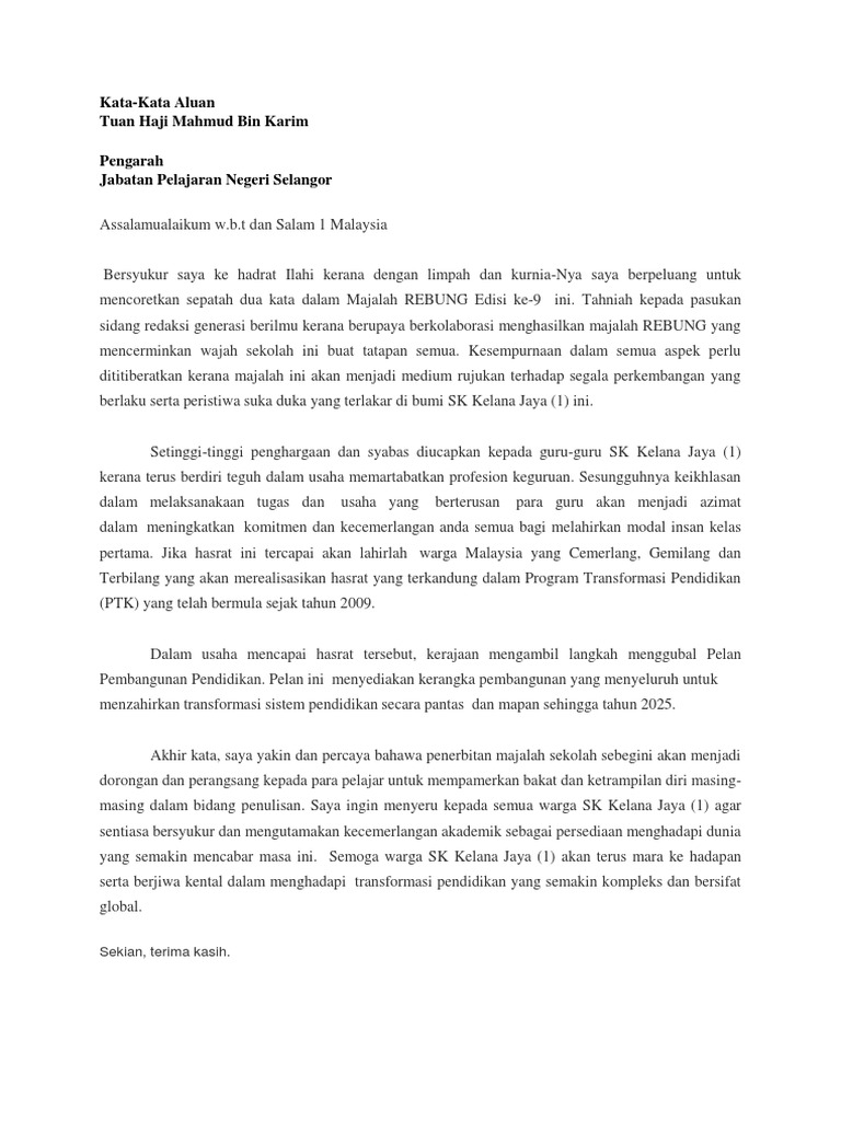 Contoh Ucapan Kata Alu Aluan Pengerusi Untuk Majalh Sekolah Karangan