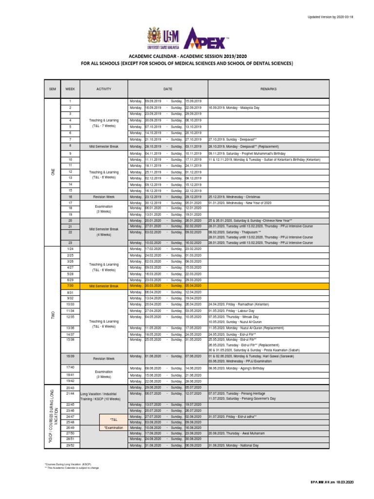 Academic Calendar Academic Session 2019 2020 For All Schools Except For School Of Medical Sciences And School Of Dental Sciences Academic Term Malaysia