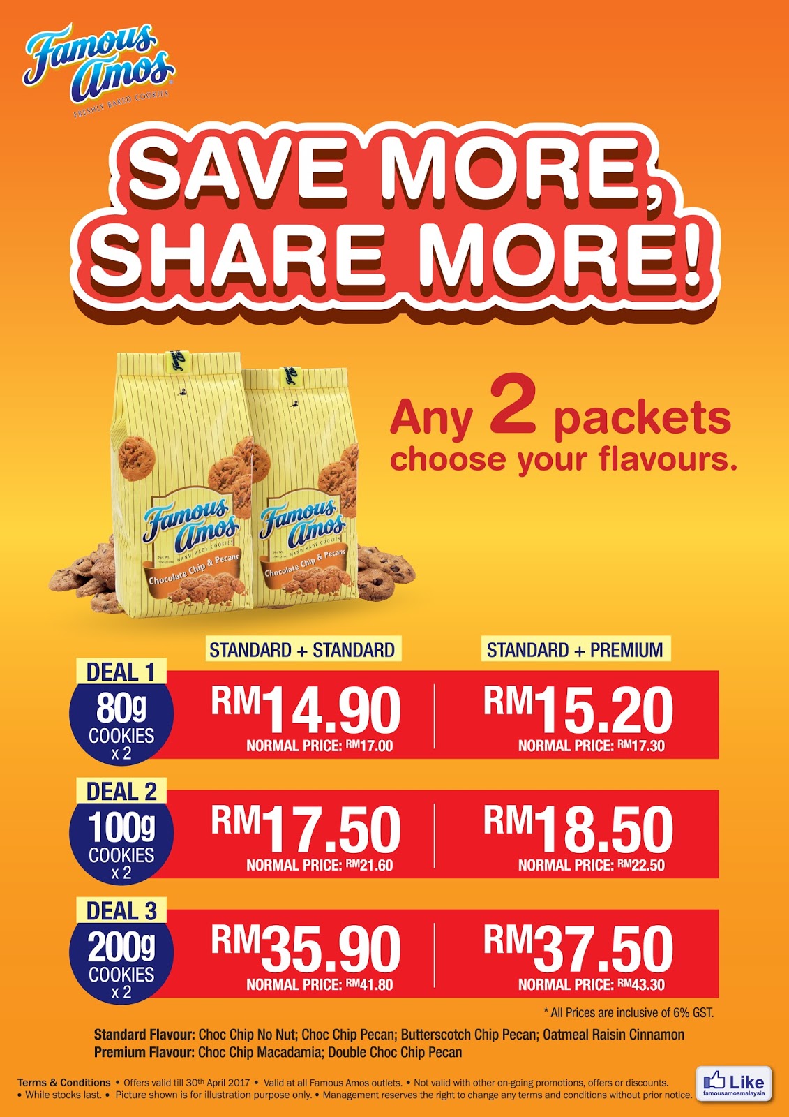 Famous Amos 2 Packets Deals 80g Rm14 90 Normal Price Rm17 100g Rm17 50 Np Rm21 60 200g Rm35 90 Np 41 80 Until 30 April 2017