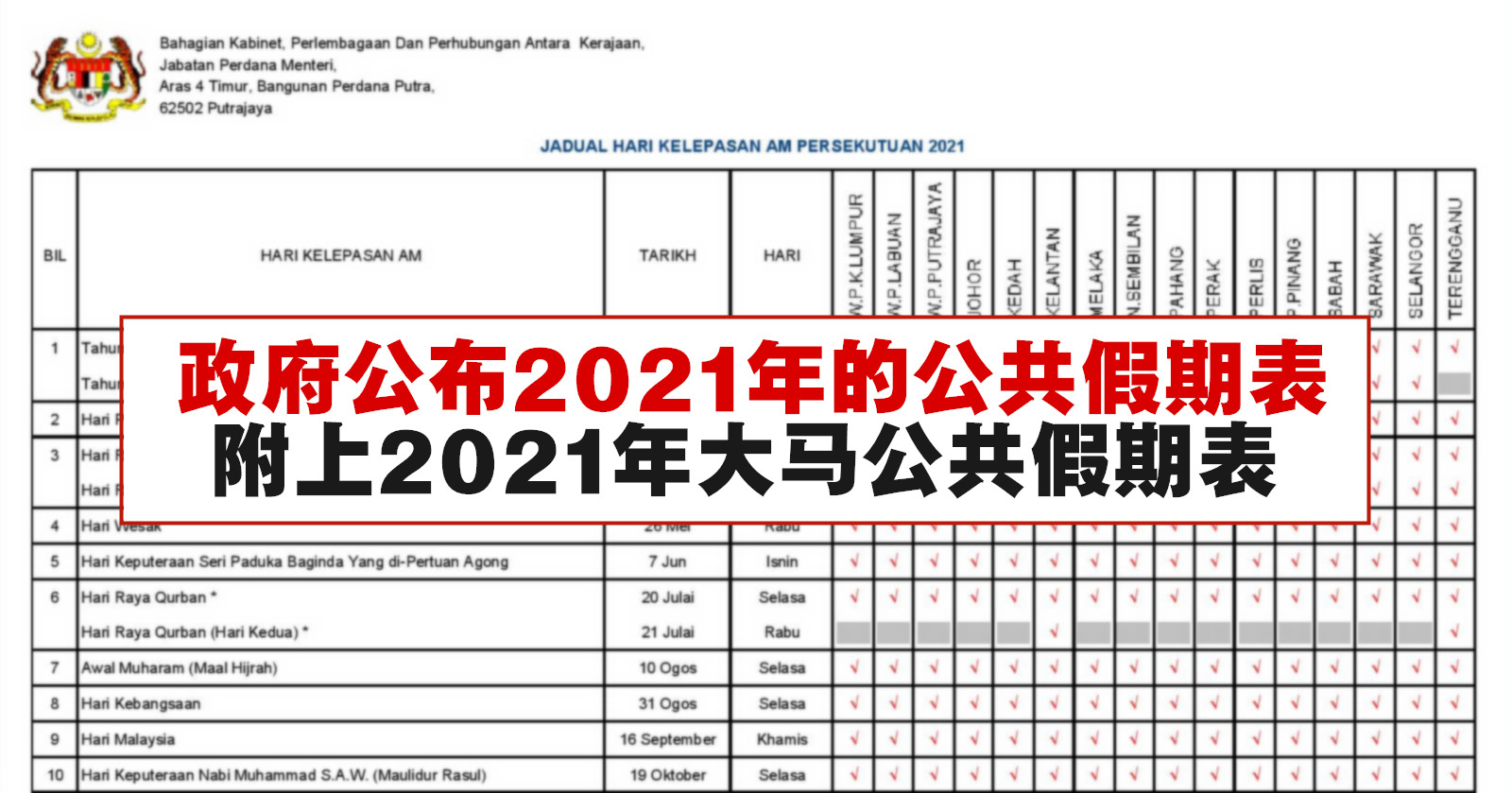 2021年马来西亚公共假期表 Winrayland