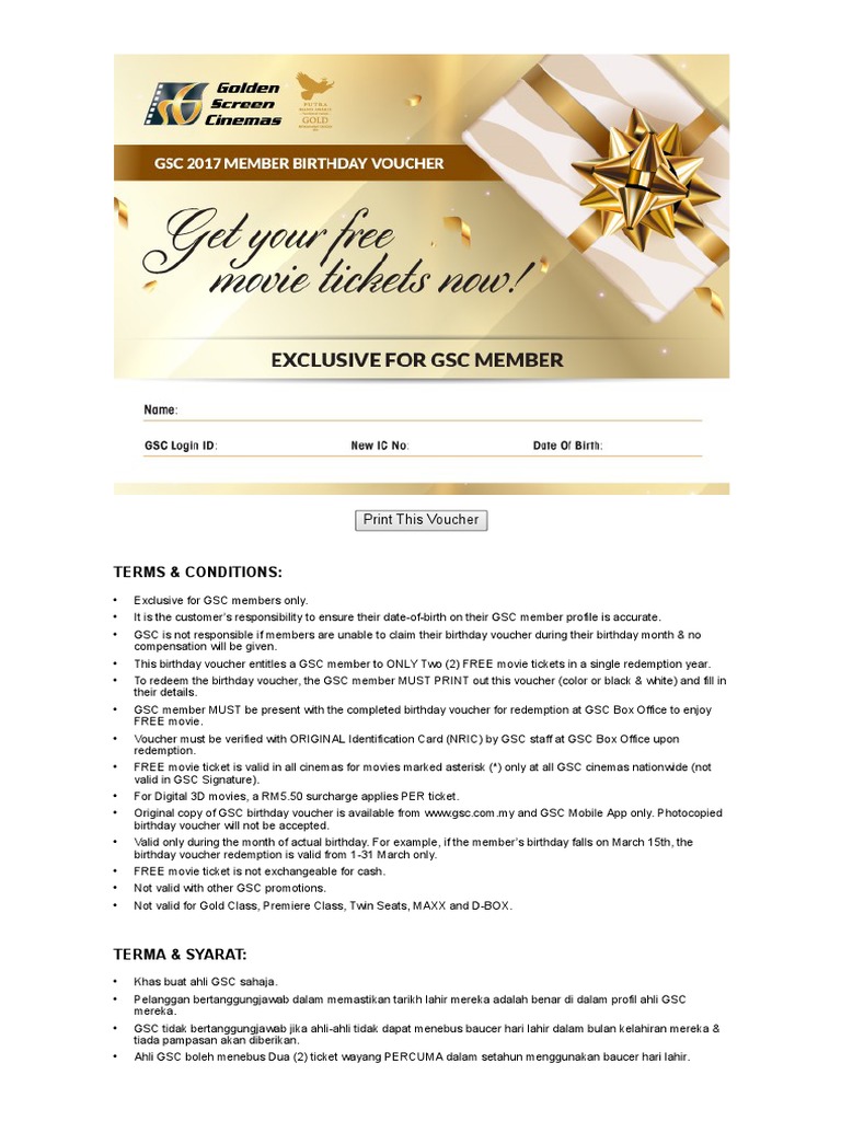 Gsc Cinemas Free 2 Movie Tickets During Your Birthday Month Sign Up As Website Member For Free To Print Birthday Treat Coupon