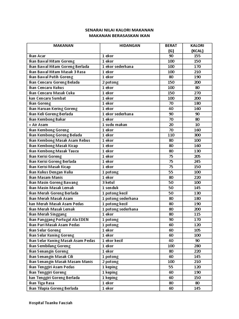 Senarai Nilai Kalori Makanan Makanan Htf Moh Gov My V2 Uploads Ikan Pdf Ikan Senangin Masak Cili 1 Potong 60 145 Ikan Senangin Masak Masam Manis 2 Potong 100 210 Ikan Tenggiri