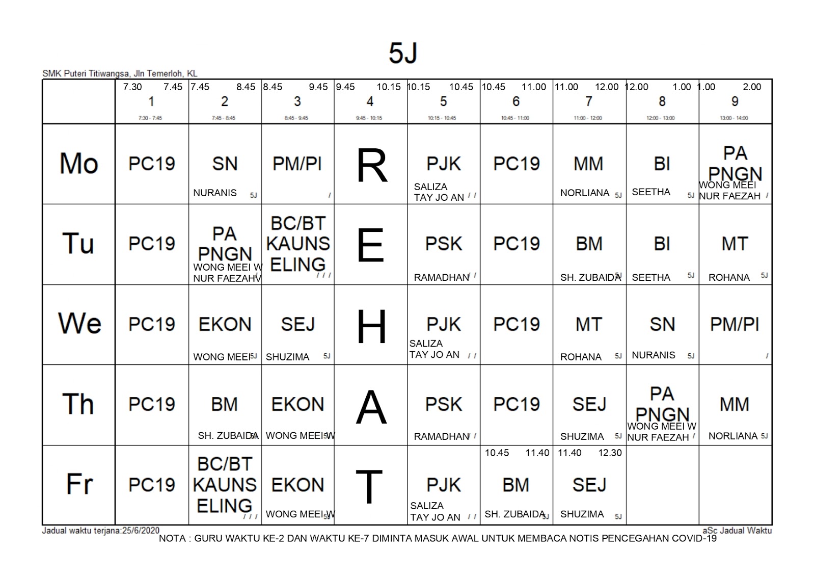 Makluman Jadual Waktu Kelas Bil 1 2020 Tingkatan 3 4 5 Smk Taman Sea