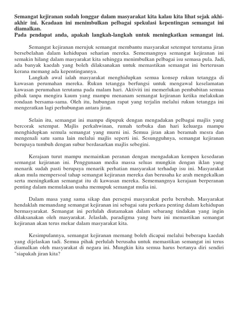 Zainab binti muhammad dalam mendepani era modenisasi pada abad 21 kini dunia menyaksikan iktisad negara yang kian membangun seperti cendawan tumbuh selepas hujan. Bagai enau dalam belukar melepaskan pucuk masing masing 2. Semangat kejiranan semakin luntur kerana sikap masyarakat yang terlalu sibuk bekerja dari pagi hingga malam lalu tiada masa untuk bertegur sapa dengan jiran aa. Ipendidikan karangan langkah dan usaha memupuk semangat kejiranan dalam kalangan masyarakat disemak dan dikemaskini pada pukul 3 15 pm 25 jun 2020 soalan berkaitan semangat kejiranan kerap digunakan oleh sekolah untuk menguji tahap penulisan para pelajar.