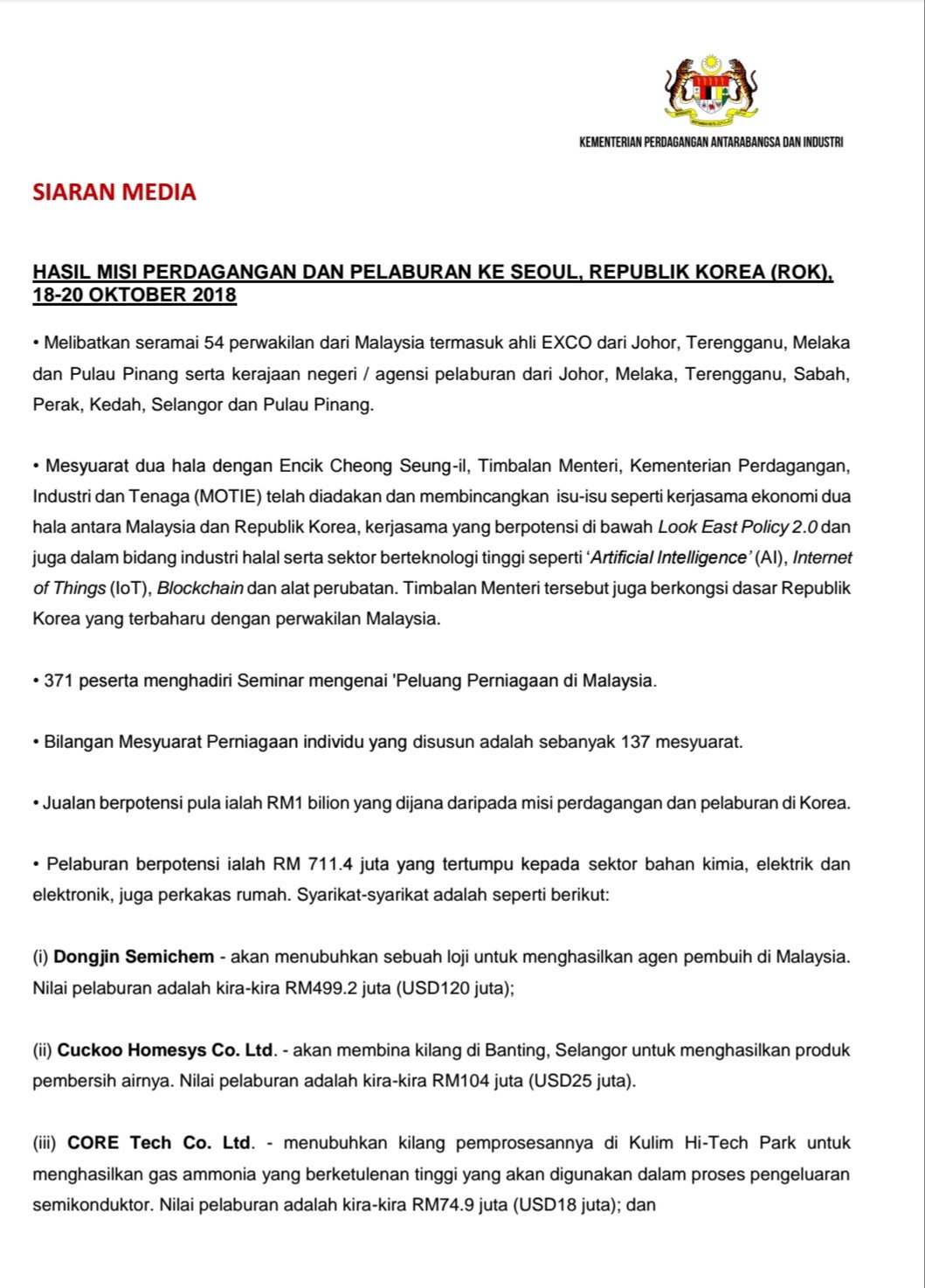 Miti Malaysia On Twitter Media Release Outcome Of The Trade And Investment Mission To Seoul Republic Of Korea Rok 18 20 October 2018 Darellleiking Imokman Ishamishak2 Officialmida Matrade Bernamadotcom Rtm Malaysia Malaymail Tmreserve